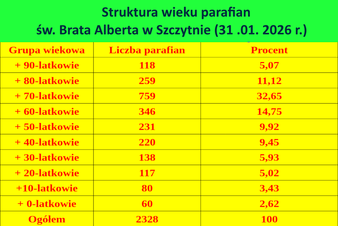 Parafia św. Brata Alberta w Szczytnie znajduje się w fazie gwałtownego wymierania. Tabela pokazuje „odwróconą piramidę wieku”, która jest skrajnie niebezpieczna dla przetrwania jakiejkolwiek wspólnoty. Oto kluczowe wnioski: 1. Senioralne „oblężenie” Aż 48,84% (niemal połowa!) wszystkich parafian to osoby powyżej 70. roku życia. Najliczniejsza grupa to 70-latkowie (ponad 32%), co oznacza, że za 10–15 lat, przy naturalnej kolei rzeczy, liczebność parafii spadnie o co najmniej 1/3, jeśli nie dojdzie do napływu nowych mieszkańców. 2. Demograficzna pustynia wśród młodych Dane dla najmłodszych grup są alarmujące: 0-latkowie (2,62%) oraz 10-latkowie (3,43%) stanowią łącznie zaledwie 6% parafii. W parafii jest dwukrotnie więcej osób po 90. roku życia (118) niż niemowląt i małych dzieci (60). To sytuacja bez precedensu, oznaczająca brak jakiejkolwiek zastępowalności pokoleń. 3. „Wyrwa” pokoleniowa (20-40 lat) Grupy wiekowe, które powinny być fundamentem wspólnoty i rodzicami nowych parafian (20- i 30-latkowie), to zaledwie ok. 11% całości. Świadczy to o masowym odpływie młodych ludzi ze Szczytna lub o całkowitym zerwaniu więzi tej grupy wiekowej z Kościołem. 4. Co to oznacza dla przyszłości? Wymieranie naturalne: Przy tak niskiej liczbie urodzeń i tak dużej grupie seniorów, parafia w obecnym kształcie przestanie istnieć w ciągu jednego pokolenia. Kwestie ekonomiczne: Utrzymanie infrastruktury parafialnej przy malejącej liczbie wiernych i rosnących kosztach (oraz niskich dochodach grupy senioralnej) będzie coraz trudniejsze. Duszpasterstwo senioralne: Parafia de facto staje się „domem opieki duchowej” – większość aktywności musi być skierowana do osób starszych, bo młodych fizycznie tam nie ma. Podsumowując, dane z 31 stycznia 2026 roku kreślą obraz wspólnoty, która znika na naszych oczach. Bez fundamentalnych zmian demograficznych w całym regionie, proces ten wydaje się nieodwracalny.