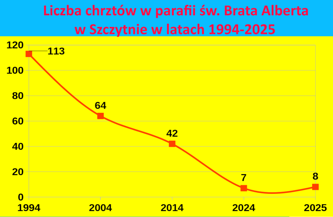 Źródło: Archiwum Parafialne, Księgi chrztów z lat 1994-2025. Wspólnota znajduje się w fazie gwałtownego kurczenia się. W ciągu zaledwie 30 lat (1994–2024) liczba chrztów spadła o ponad 93% (ze 113 do zaledwie 7 rocznie). Oznacza to, że dopływ nowych członków praktycznie ustał.